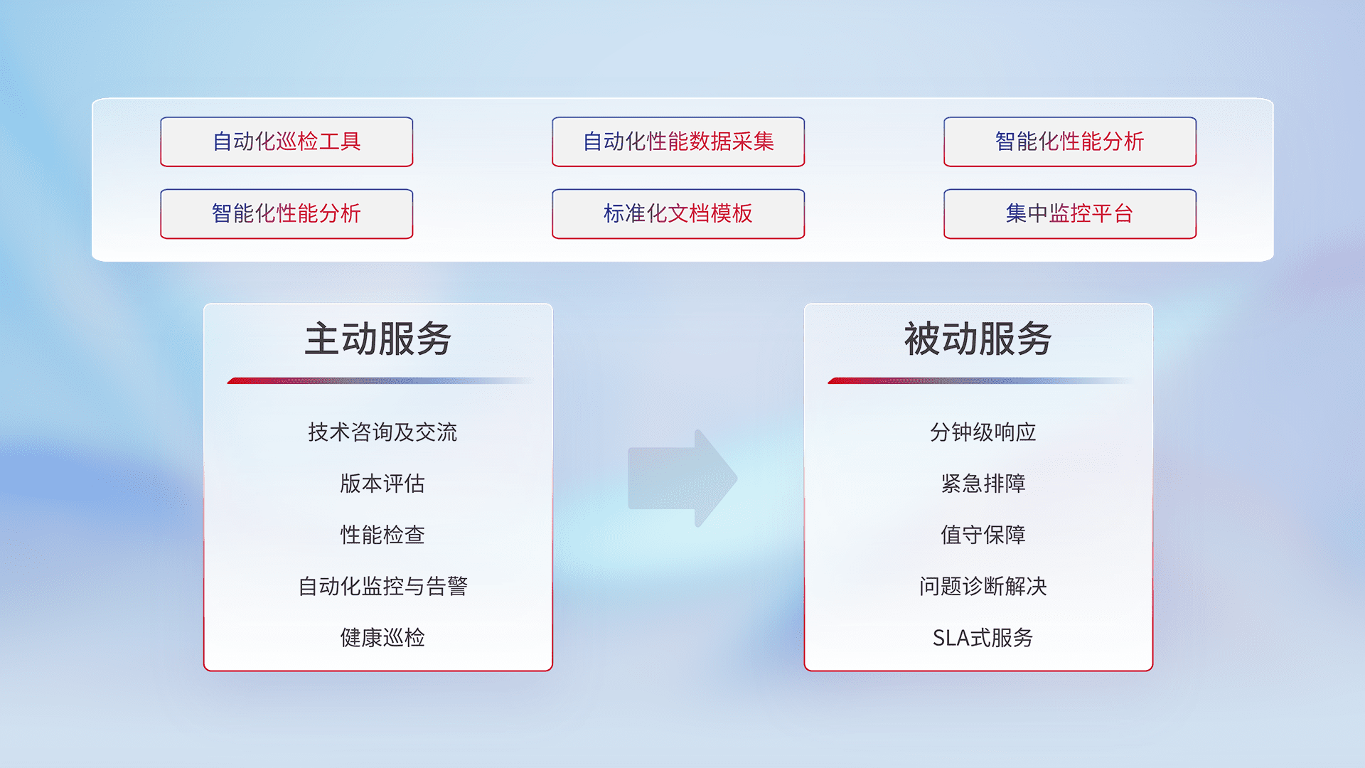 智能化工具和标准化文档,,,,保障服务质量,,,,提供主动服务(包含技术咨询、、、版本评估、、性能检查、、、、自动化监控与告警、、、、健康巡检)和被动服务包含(分钟级响应、、、、紧急排障、、、、值守保障、、、、问题诊断解决、、、SLA服务)。。。